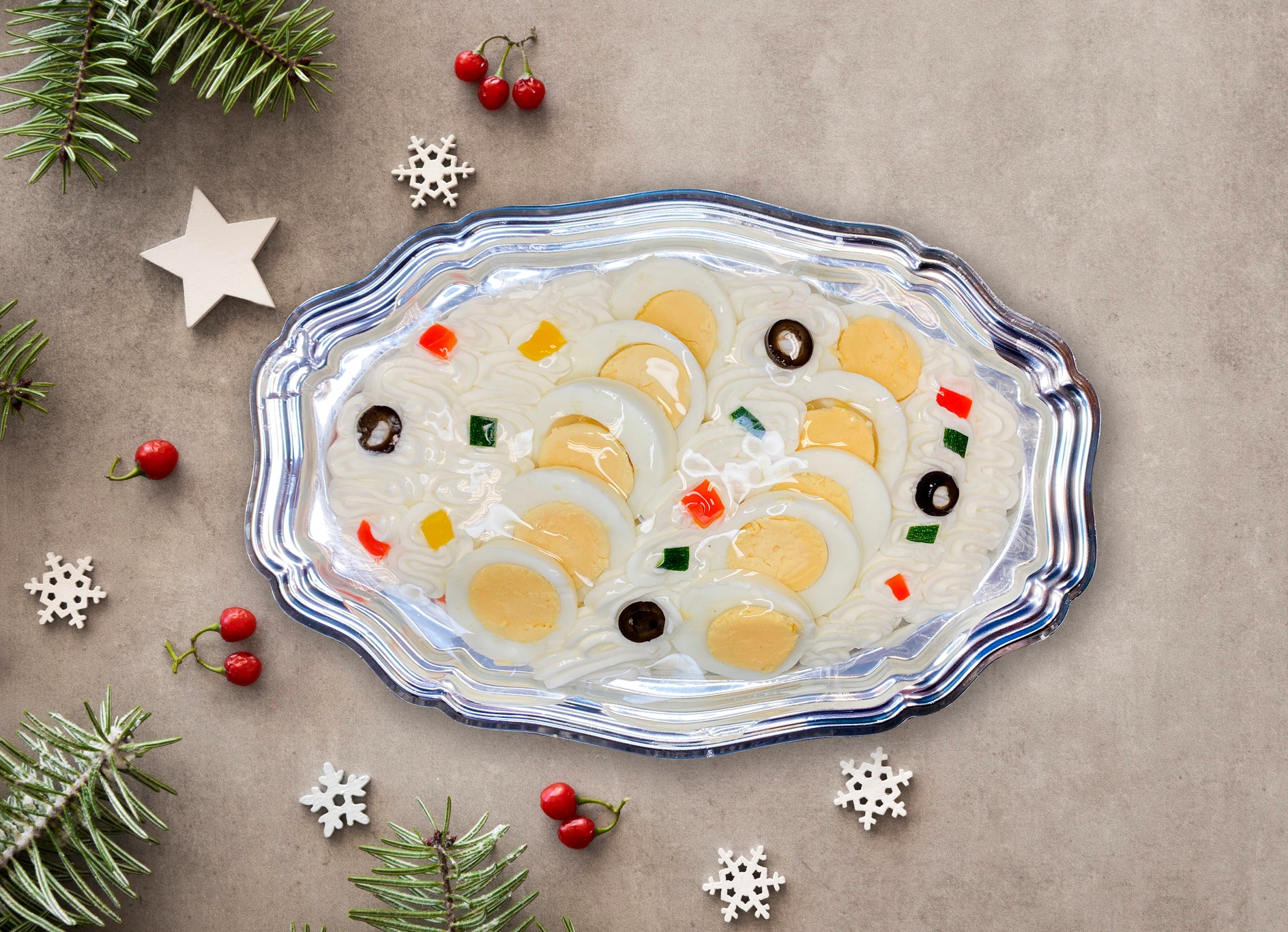 Insalata russa su vassoio decorata con uova e verdure.