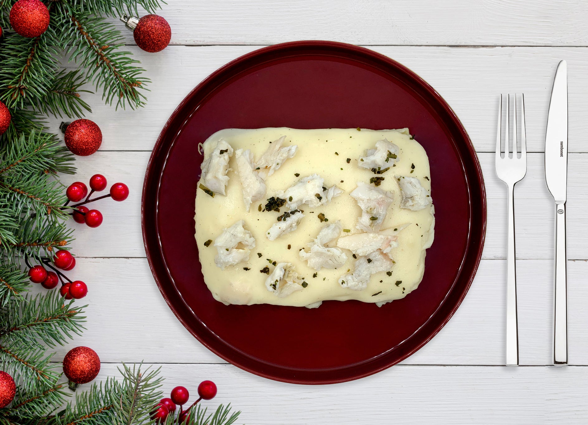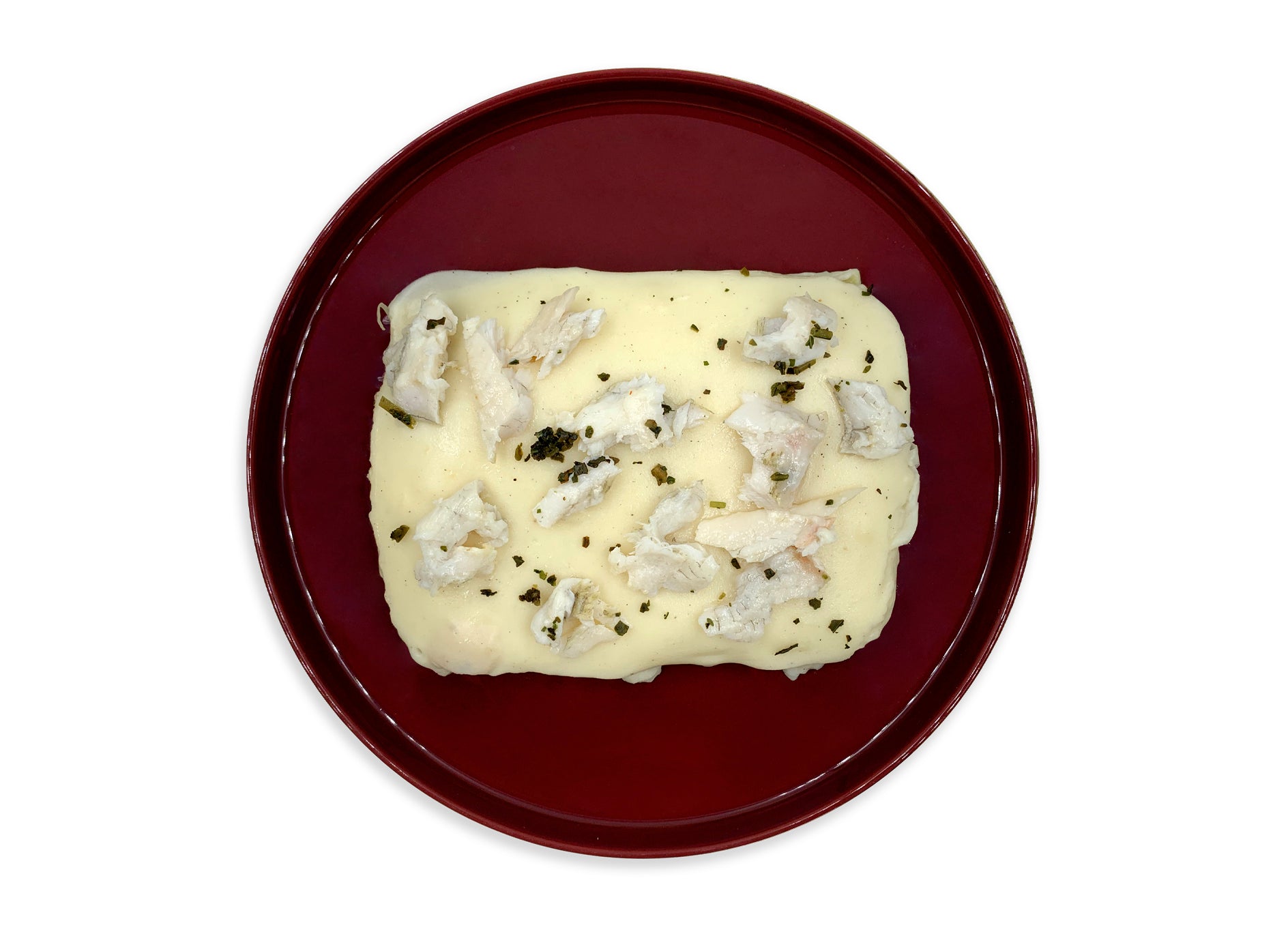 Preparazione Gastronomica: ingredienti: pasta sfoglia (farina di GRANO, acqua, sale) besciamella (LATTE, farina di GRANO tenero, BURRO, noce moscata), BRANZINO 22%, cipolla, aglio, olio extravergine di oliva.