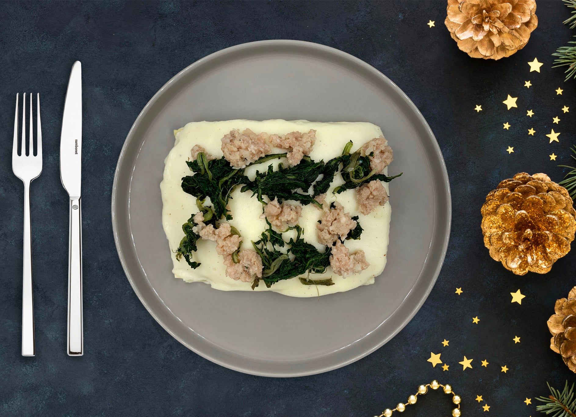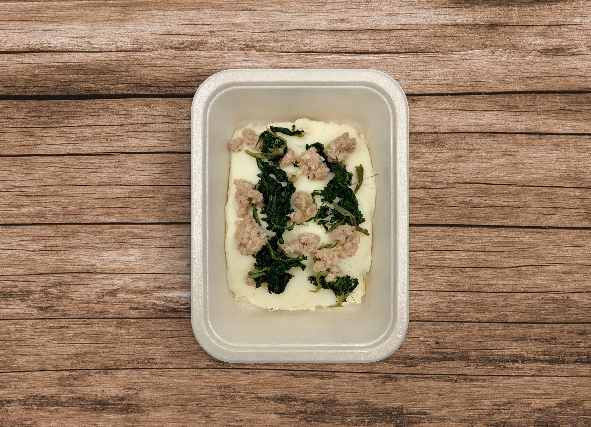 Preparazione Gastronomica: ingredienti: besciamella (LATTE, farina di GRANO tenero tipo 00, olio di semi di girasole, noce moscata), friarielli 23%, pasta all'UOVO (semola di GRANO duro, UOVA pastorizzate 20%, acqua, sale, olio di oliva), salsiccia 14% (carne di suino 70%, acqua, sale, fibra vegetale, zuccheri: destrosio, aromi, spezie, correttore di acidità: E262, E331, antiossidanti E300, E301), Emmental (LATTE, sale, caglio), Grana Padano (LATTE, sale, caglio, lisozima proteina da UOVO), olio extravergine di oliva, sale, peperoncino, aglio.