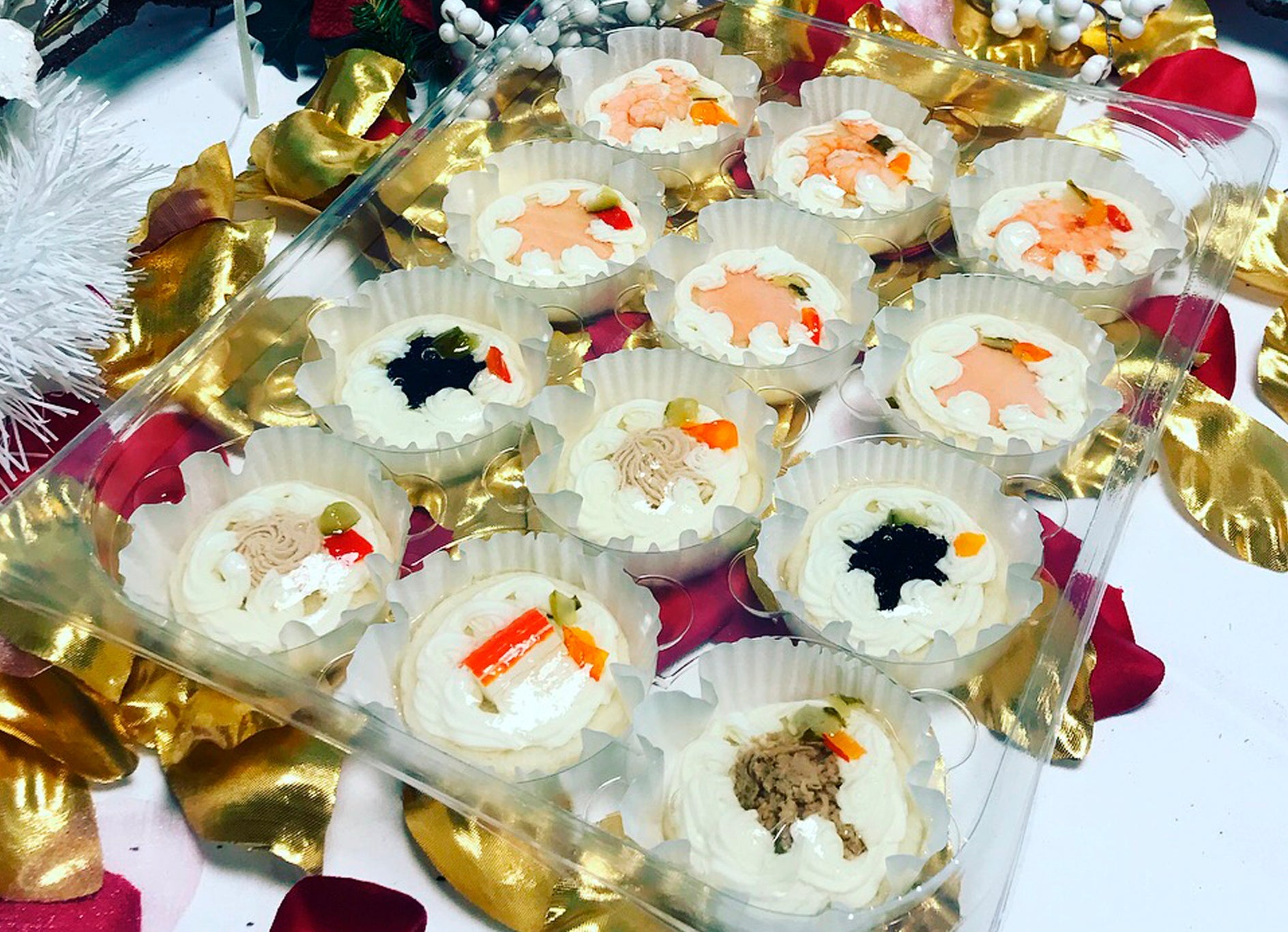 gelatina (acqua, gelatina animale alimentare (idonea al consumo umano), sale, esaltatore di sapidità, glutammato monosodico, aceto di vino (contiene SOLFITI), zucchero, sorbato di potassio E202, pane (farina di GRANO tenero 0, acqua, LATTE, olio vegetale, destrosio, sale, lievito, farina di CEREALI contenente GLUTINE maltati, farina di SOIA), maionese (olio di semi di girasole, UOVA, acqua, aceto di vino (contiene SOLFITI), zucchero, sale, SENAPE, amido di mais, limone, acido citrico E330, potassio sorbato E202). Farcitura: SURIMI (tranci all'origine SURIMI 38% (MERLUZZO Alaska pollak, zucchero, stabilizzante E420, E452), SALMONE (Salmo salar), GAMBERETTI (Caridea), uova di LOMPO, TONNO (Thunnus), acqua, UOVO, amido di FRUMENTO, fecola di patate, sale, sortitolo, fibra di FRUMENTO, aroma di GRANCHIO, glutammato monosodico E621, coloranti E120, E160), sale, correttore di acidità: E330, conservanti E211, E202, decoro: cetrioli, peperoni.